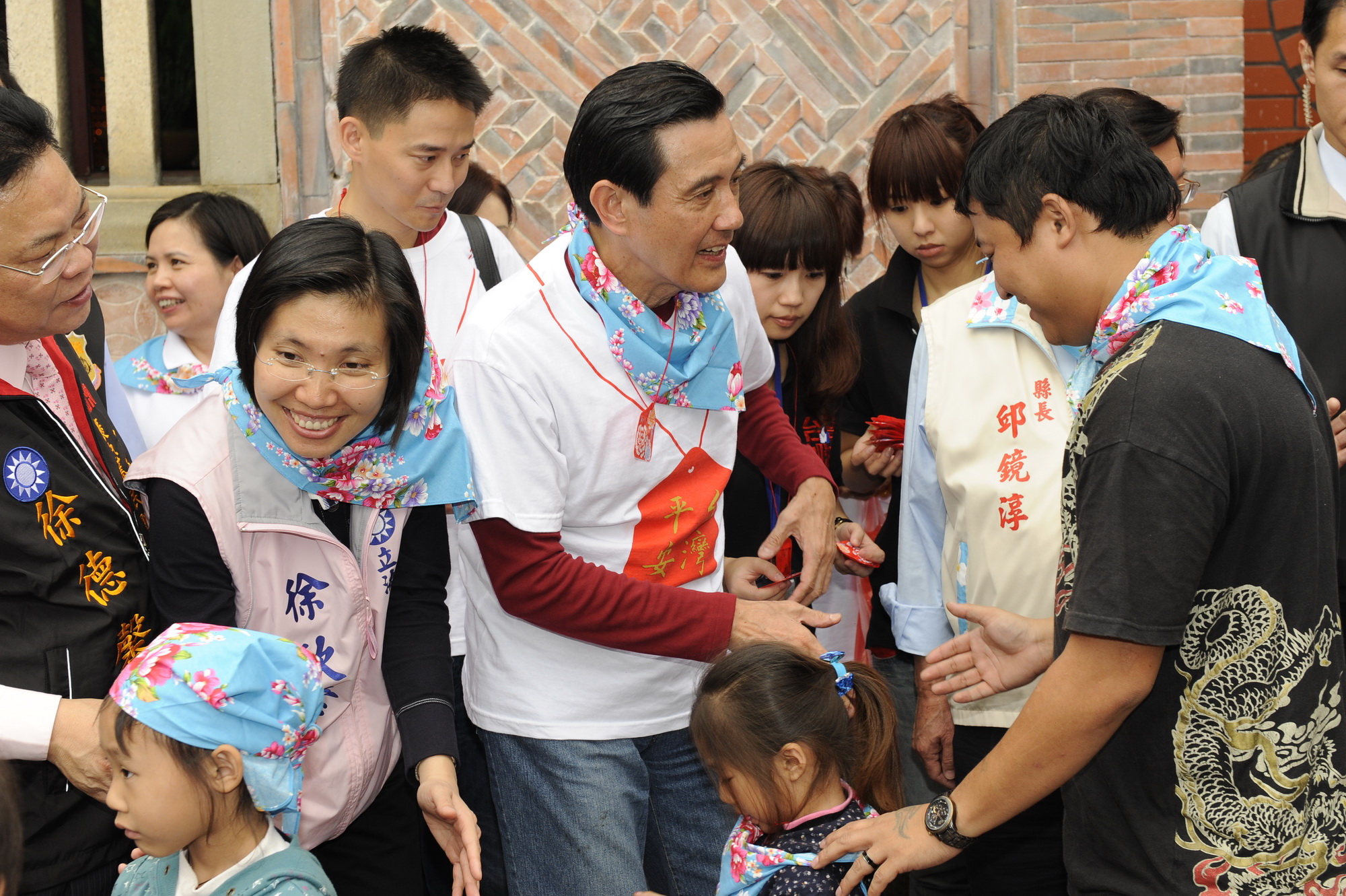 馬總統至義民廟上香 立委候選人徐欣瑩陪同發放限量版客家花布台灣平安福馬英九總統的百年老廟巡禮祈福活動,11/26(六)掀起最高潮,來到新竹縣新埔褒忠義民廟,完成第一百間老廟上香祈福活動,義民廟財團董事長徐德馨、新竹縣縣長邱鏡淳、馬吳全國客家後援會總召集人鄭永金、新竹縣立法委員候選人徐欣瑩、縣黨部主委張逸華、新埔鎮鎮長賴江海、以及在地鄉親近2000人蜂擁而至義民廟,同時也從馬總統、立委候選人徐欣瑩、與全國客家後援會總召集人鄭永金的手上,領到今天剛剛出爐的首發限量版客家花布台灣平安福。 下午2:30左右,馬總統在立委候選人徐欣瑩的陪同下進入義民廟,馬總統與徐欣瑩也分別為表演客家獅的兩組小朋友掛上台灣平安福。他們首先至天公爐三拜上香,接著祭拜義民爺、向義民爺獻花、獻果、獻酒三獻禮,將今天首發的限量版客家花布台灣平安福過爐,隨後馬總統全程用客家話向在場鄉親發表談話:他表示義民廟是客家精神的精神指標,義民爺就是為了保衛家鄉犧牲生命的義民軍,是我們客家人的在地守護神,是保家衛國的忠義象徵。他每次來到義民廟參香祈福,就對「帶給臺灣平安幸福」有更深一層的體會與責任。他是客家人,不是人客,更努力學習客家話,義民廟是他參拜的第一百間廟宇,具有特殊意義,希望新竹鄉親能給他再一次機會服務台灣人民。